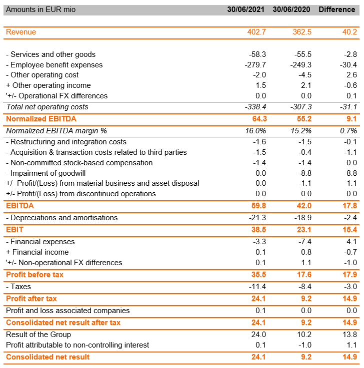 The financial result per 30 June 2021 amounts to EUR -3.1 million, mainly due to the interest costs of the subordinated EUR 80 million bond issued in June 2019, the committed EUR 125.0 million revolving credit facility and financial charges on lease liabilities.